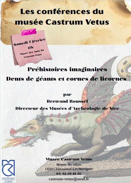 Comtesse de Provence, dans la tourmente du quatorzième siècle. Samedi 18 avril 2026 à 17h Musée des Amis de Castrum Vetus Présentation de la conférence : Tout au long de son histoire, jusqu'à son rattachement à la France en 1481, le comté de Provence connut bien des vicissitudes. De grands moments certes, glorieux même, mais également des heures terribles durant lesquelles nos comtes durent fdaire face à des situations extrêmes. Ce 14ème siècle, dont le vais vous parler, sera justement l'un de ces siècles les plus sombre de notre histoire. Et c'est là que va naître, à la tête de notre comté, l'une des figures les plus originales, les plus contestées et les plus méconnues peut-être de ce comté de Provence. Ce sont les grandes heures de ce siècle et le destin chaotique de cette Reine Jeanne que je me propose de vous faire découvrir. Samedi 7 mars 2026 Présentation du conférencier : Infirmier à la retraite, Jacques Delenne s'est intéressé très tôt à l'histoire de la santé par l'objet. Collectionneur, il a participé depuis près de 20 ans à de nombreuses reconstitutions historiques, de la Renaissance à la Grande Guerre en passant par les campagnes du 1° empire. C'est donc tout naturellement qu'il en a tiré une conférence sur "L'Art Médical à la Renaissance". Présentation de la conférence : La Renaissance se répand en Europe du début du XV°s à la fin du XVI°s. Cette courte période de 2 siècles fut cependant riche en découvertes. L'architecture, la sculpture, la peinture ont connu leur âge d'or et les sciences ont jeté les bases de nos connaissances. Après avoir présenté cette tranche d'Histoire, l'art médical sera évoqué. Seront abordées l'hygiène et la thérapeutique, puis les professions de la santé: médecin, barbier-chirurgien, arracheur de dents, épicier apothicaire et les grands noms d'icelle. La conférence se terminera avec le "Magasin des instruments". PREHISTOIRES IMAGINAIRES![]() Dents de géants et cornes de licornes par Bertrand ROUSSEL - Directeur des Musées d’Archéologie de Nice Samedi 7 février 2026 à 17h au musée des Amis de Castrum Vetus Résumé : De tout temps l’homme a découvert des ossements et cherché à y donner un sens qui aujourd’hui nous semble farfelu : géant, cyclope, licorne, dragon… À partir du XVIIe siècle, des scientifiques ont su développer leur esprit critique pour sortir de ces interprétations faciles et développer de nouvelles théories. La science de l’étude des êtres anciens – la paléontologie – et de l’anatomie comparée finiront par reléguer ces animaux fantastiques au statut de chimères. Le préhistorien Bertrand Roussel nous emmène aux époques où l’on croyait aux créatures mystérieuses puis, avec l’arrivée des sceptiques, à ce moment où la connaissance fait disparaître l’extraordinaire. Présentation du conférencier : Bertrand Roussel est docteur en préhistoire et directeur des musées d’Archéologie de Nice (Terra Amata et Cimiez). Il porte un intérêt tout particulier aux passerelles existant entre la science et l’art, ainsi qu’aux croisements des compétences. Il est l’auteur ou le coauteur de nombreux ouvrages, tels que Le Guide des sites préhistoriques : Provence-Alpes-Côte d’Azur, Produire le feu de la préhistoire à nos jours, Les Temps suspendus, Langage de pierre, La Grande Aventure du feu et Les Idées reçues de la préhistoire. Publication : ROUSSEL B. (2021). - Préhistoires imaginaires – Dents de géants et cornes de licornes, tome I. Editions Book-e-Book, collection Une Chandelle dans les ténèbres, n°51, Paris, 92 p. ![]() Dans le cadre des Journées du Patrimoine Européen, Dimanche 21 septembre au musée des Amis de Castrum Vetus: . | |||||
